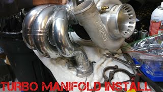 I got the turbo manifold officially bolted on after removing one of the studs to install a bolt as it would not fit. Mocked up some stuff for the oil feed and return on ...